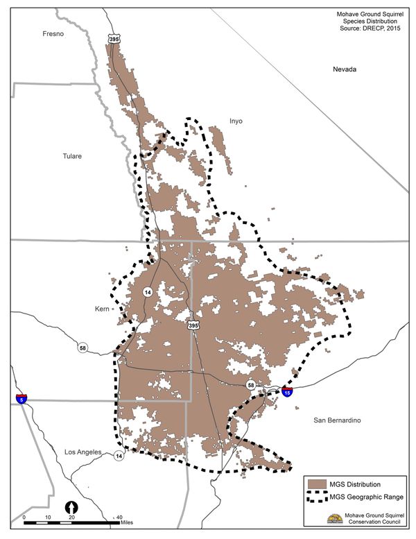The Mohave ground squirrel (Xerospermophilus mohavensis) is a species of ground squirrel found only in the Mojave Desert in California. This squirrel inhabits the western Mojave Desert in portions of Inyo, Kern, Los Angeles, and San Bernardino counties. It can occupy Joshua tree woodlands, creosote scrub, saltbush scrub and mojave mixed woody scrub. Typical forage plants are those that meet nutritional and water content requirements. These can include shrubs such as winterfat, spiny hopsage, and boxthorn (Lycium spp.).